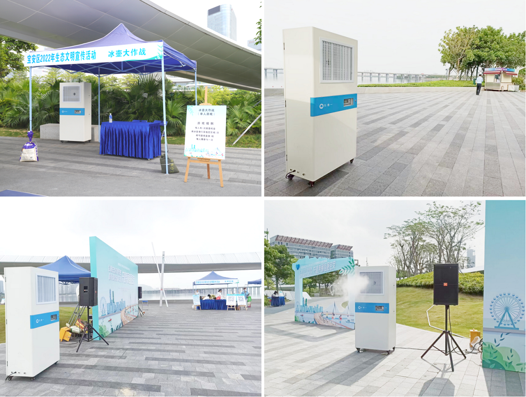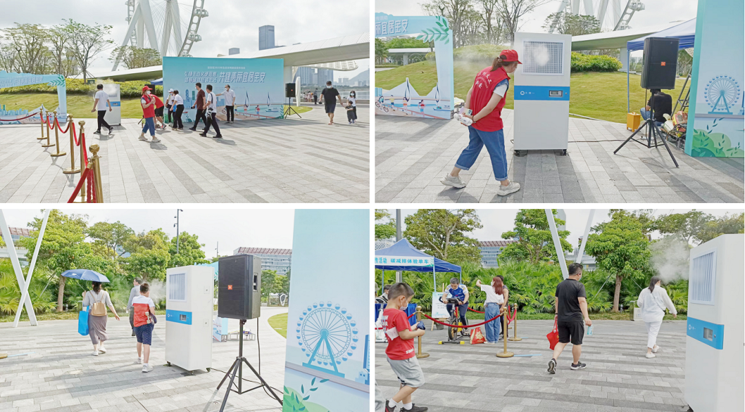 活动地点位于宝安新地标湾区之光摩天轮,正值周末往来人流众多。活动开始前,团队人员便配合主办方将设备提早运送进场,调试后安置在指定区域喷雾作业,既为当天参与活动的市民提供空气质量保障服务,同时也作为一个活“样板”向受众展示生态环保产品。