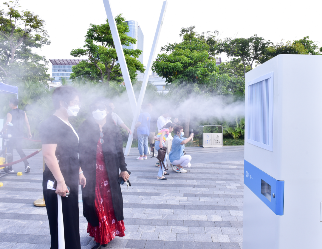 当日气温近30℃,一片艳阳高照中,“白雾袅袅”的消毒设备也吸引了来往市民的注意。不少市民经过设备时,还探头伸出双手感受喷出的“清凉”,借这个大块头遮阴纳凉。这种“润物无声”的背后是超声波雾化技术,雾化后内部雾粒直径达到10μm以下,对人体无任何刺激感和不适感。