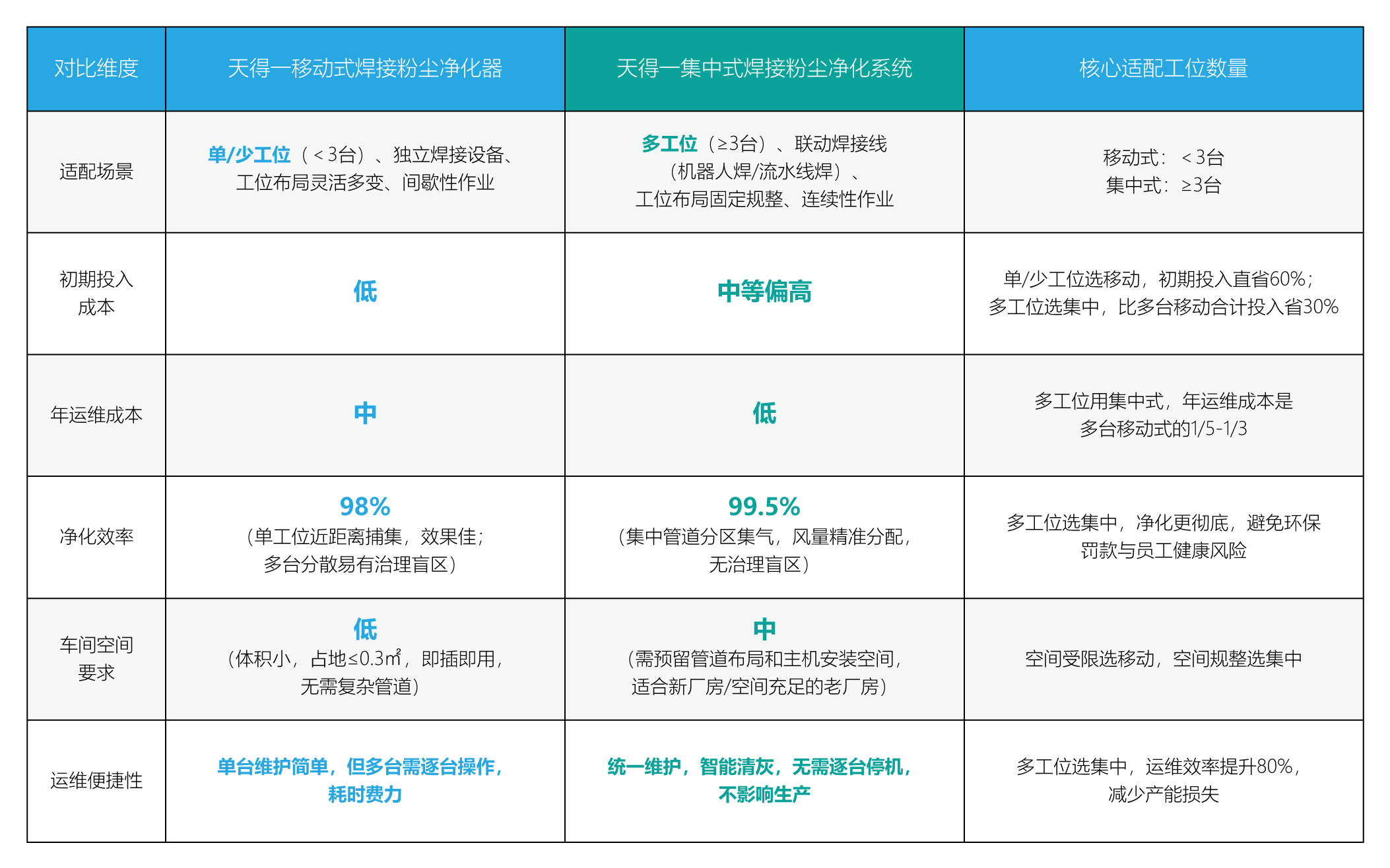 ng28(南宫)基于12年焊接粉尘治理实操经验,结合200+不同工位数量企业的实测数据,从适配场景、成本、净化效果等核心维度,直观呈现两种设备的差异,为企业选型提供科学依据(数据来源:ng28(南宫)实验室+企业1年跟踪实测):