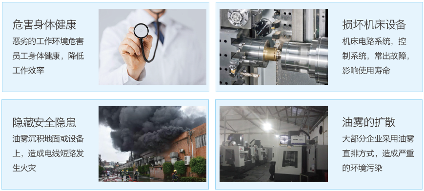 油雾主要是由固体颗粒、液态颗粒以及液体和固体颗粒悬浮于⽓体介质中形成的均匀分散体系,即以⽓溶胶的形式漂浮在作业场的空⽓中,颗粒直径⼤部分集中在1μm左右;⼩于1μm的粒⼦会被融⼊⾎液中,对员⼯健康产⽣危害;同时造成环境破坏,降低⽣产设备使⽤寿命。