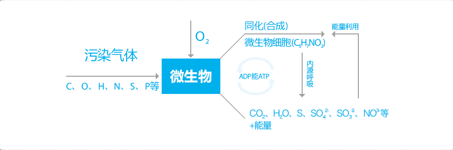 第二阶段 污染物质的生物吸附吸收过程: 水溶液中的污染成分被微生物吸附、吸收,污染成分从水中转移至微生物体内。作为吸收剂的水被再生复原,继而再用以溶解新的臭气成分。被吸附的疏水性的有机物通过微生物胞外酶对不溶性和胶体状有机物的溶解作用后,才能相继地被微生物摄入体内。如淀粉、蛋白质等大分子有机物在微生物细胞外酶(水解酶)的作用下,被水解为小分子后再进入细胞体内;