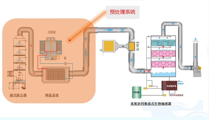 1.科学的预处理:确保末端设备高效、稳定,采用高效的静电除尘器,可以很好的去除废气中的油脂;采用高效换热器,确保废气的温度降低40℃以下,符合微生物的需求。