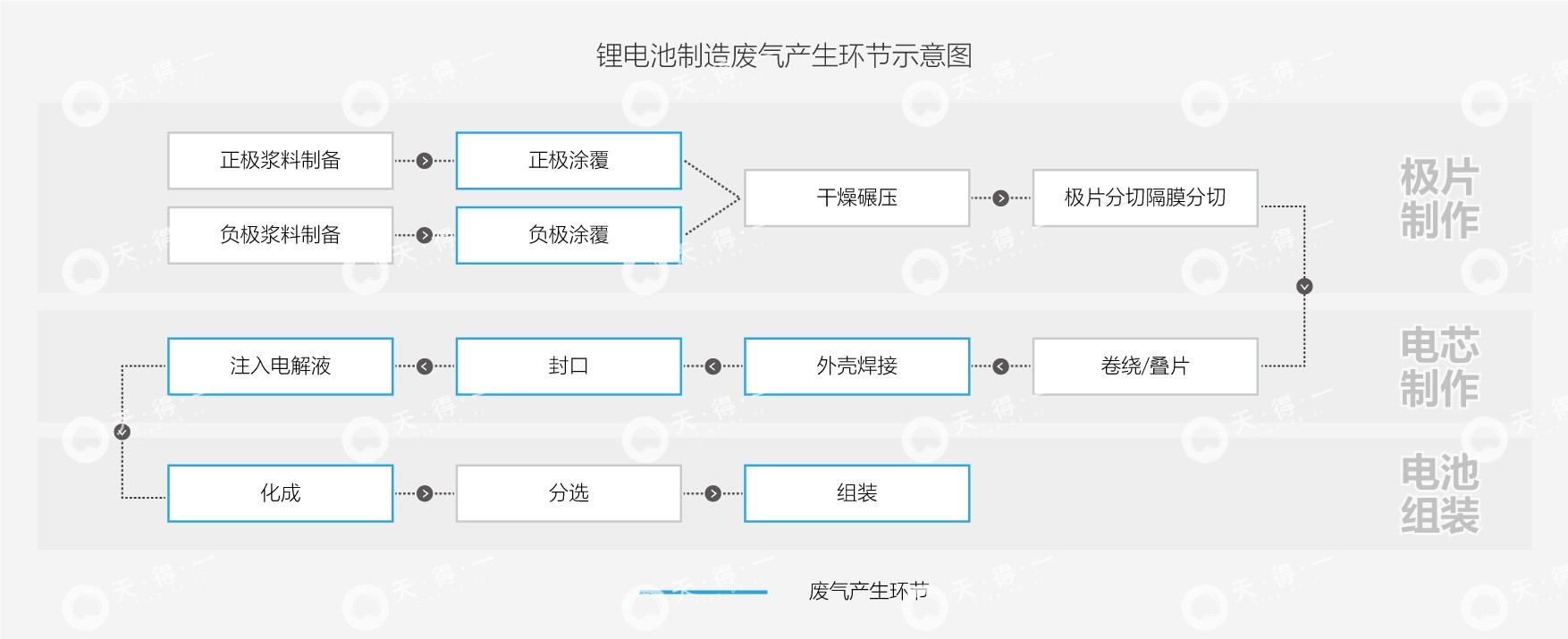 在锂电池生产中的 pack、制浆、擦拭、喷码、烤箱真空泵以及部分非动力电池注液化成等环节,会产生浓度相对较低的有机废气,其来源分散、成分多样,环境与健康影响仍不容忽视。其在pack 环节的焊接、点胶、打标等过程中会释放少量挥发性有机物;制浆与烤箱真空泵主要排放低浓度 NMP 废气;擦拭工序产生乙醇废气;喷码过程带来油墨挥发物;部分非动力电池的注液化成也会产生低浓度电解液废气。