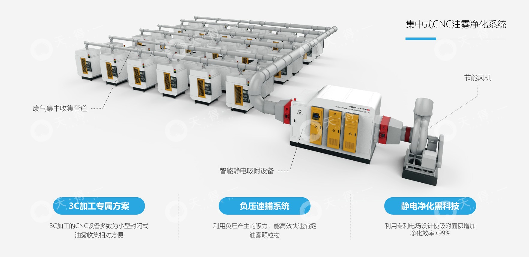 针对此类复杂废气工况,可采用我司“一拖多CNC油雾治理系统”,该系统的优势在于可根据机台摆放位置、车间高度等情况,进行精准的区域化分布式治理,每套分布式净化设备可采用 “一拖二” 或 “一拖多” 的灵活方式,对 CNC 设备产生的油雾进行精准高效治理。